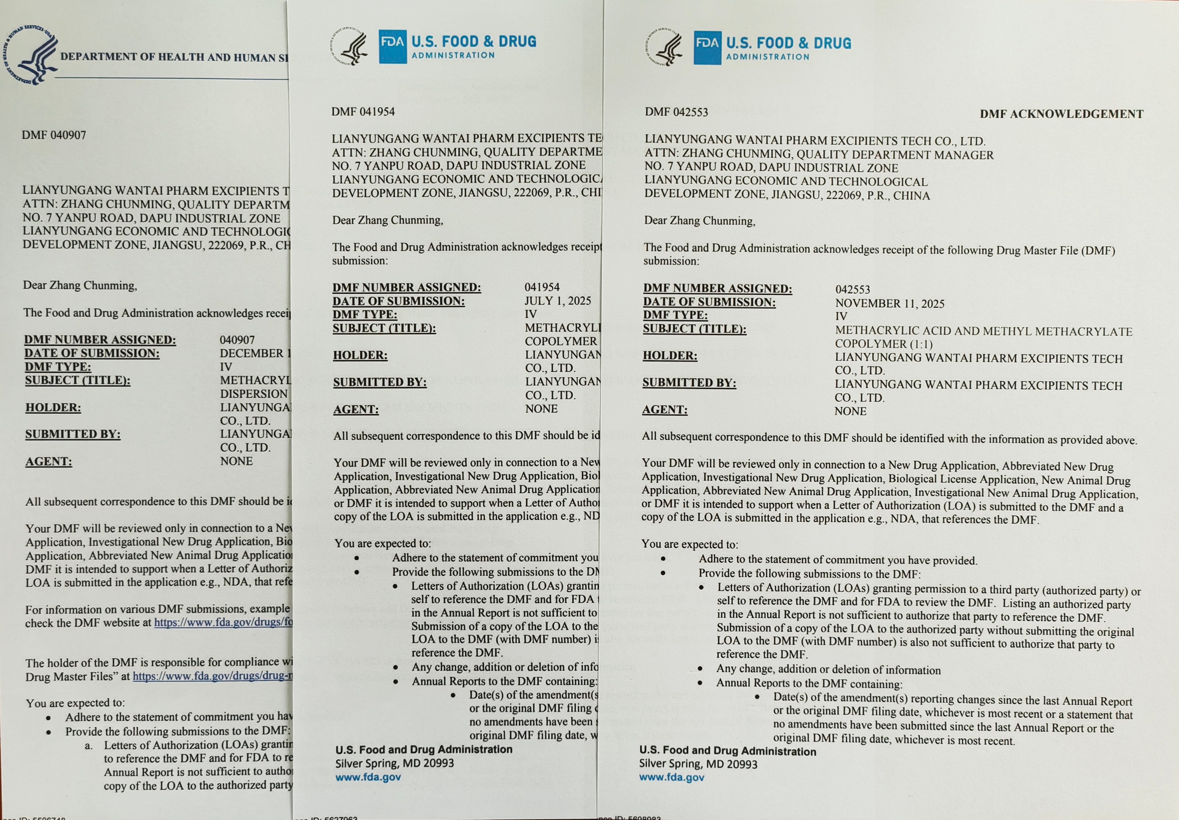 近日,万泰辅料收到美国食品药品管理局(以下简称FDA)发来的甲基丙烯酸-甲基丙烯酸甲酯共聚物(1:1)药物主文件(以下简称DMF)登记确认通知书。至此,万泰辅料共有3项产品获得DMF备案,分别是甲基丙烯酸-丙烯酸乙酯共聚物水分散体(编号0409...